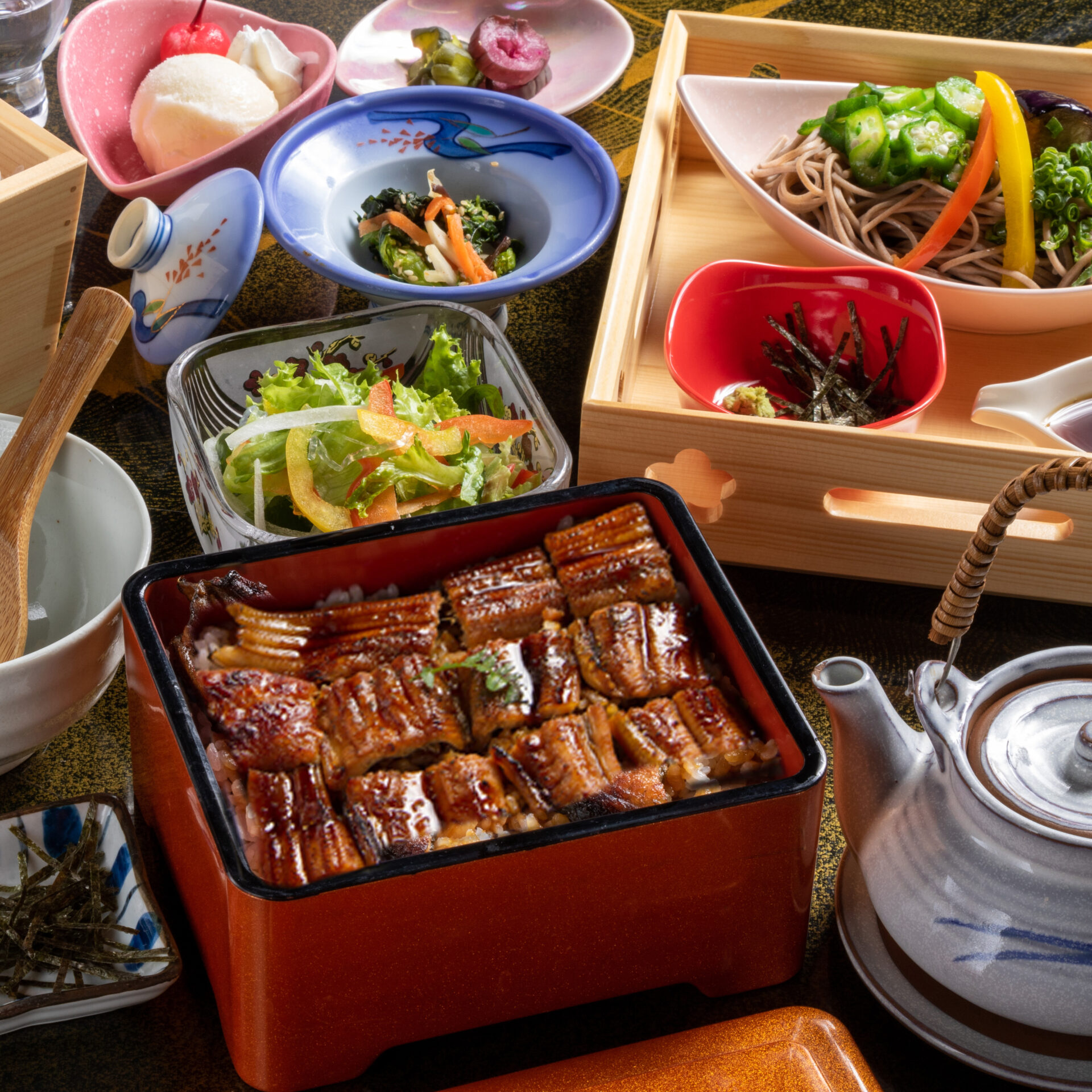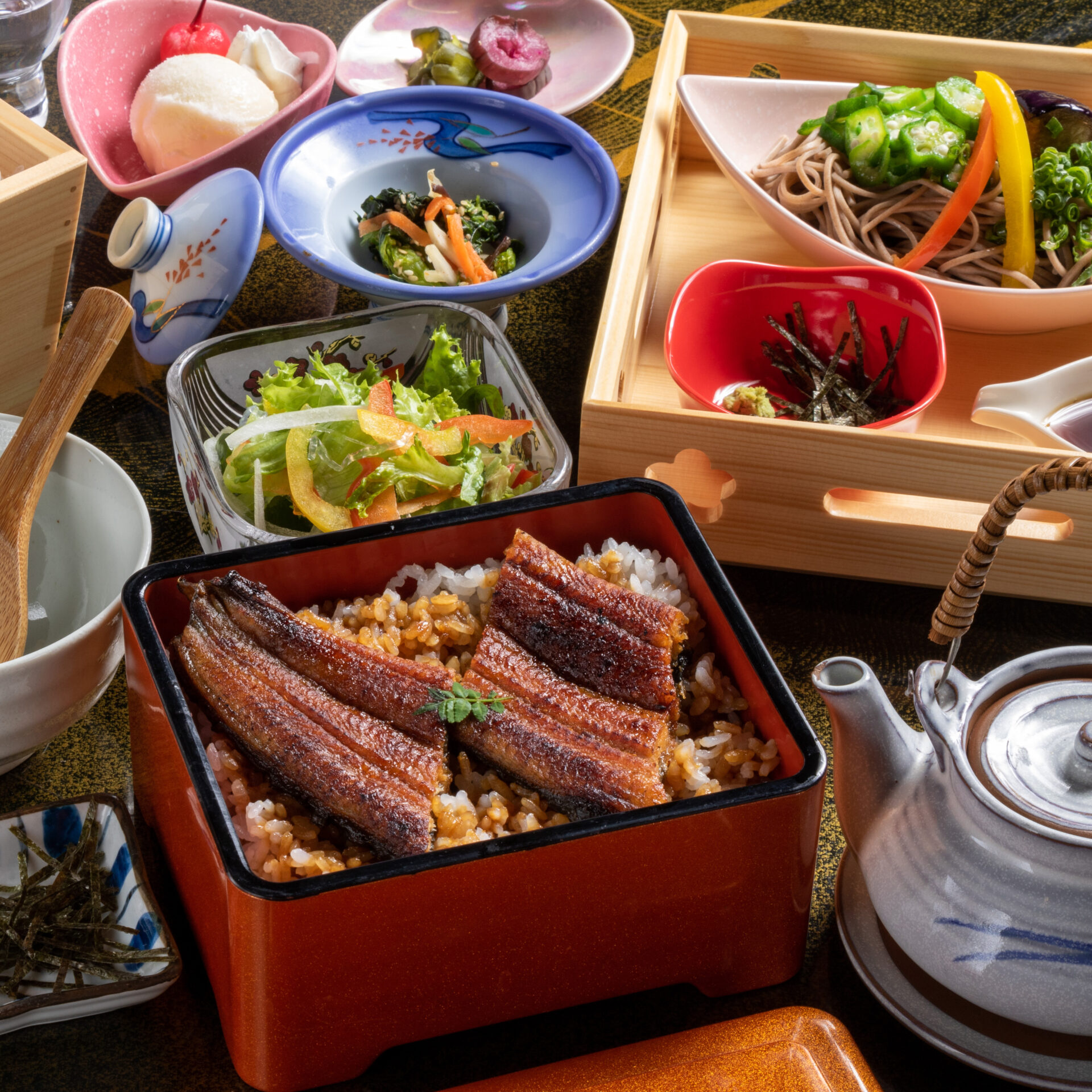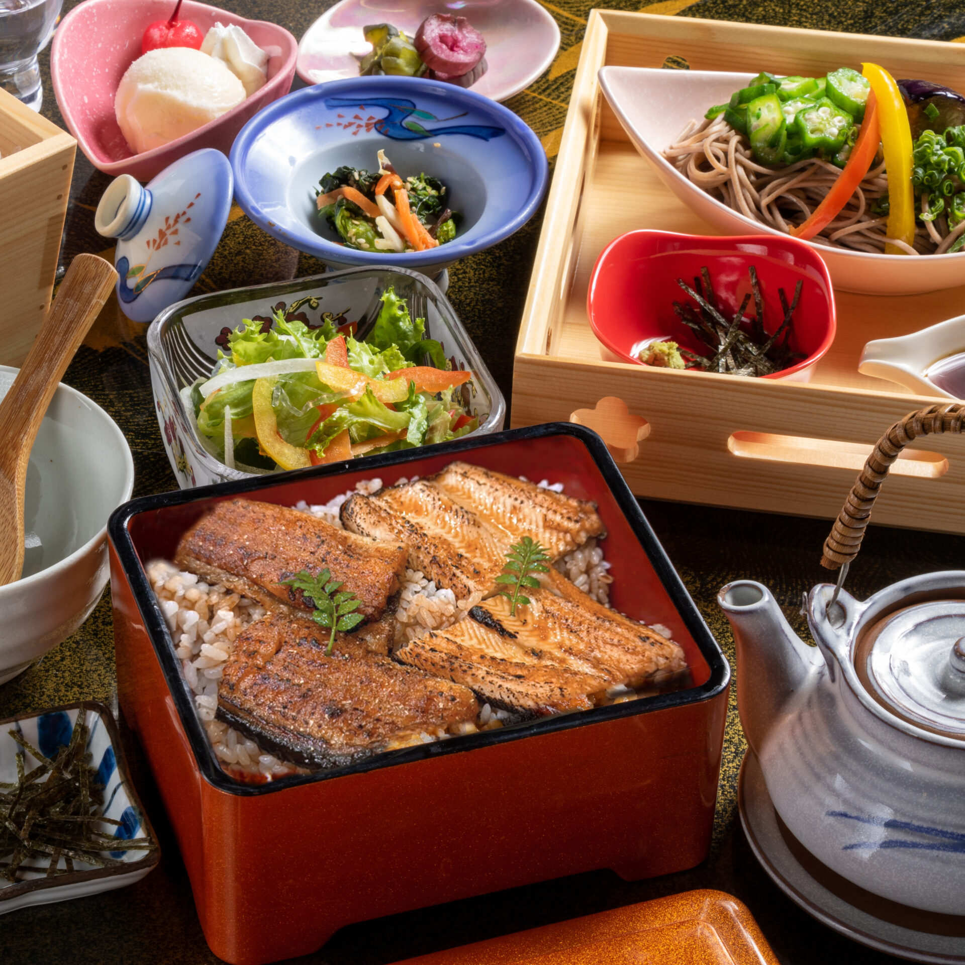 ※ランチタイム時に、【ミニうなぎ重と茶そば御膳】【特選穴子重と茶そばの満腹御膳】【釜飯と茶そばの満腹御膳】【特選かぶり寿司と茶そば御膳】は(税込3,300円)になります。【宮崎牛の炙り重御膳】は(税込3,630円)になります